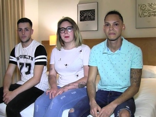 Amateur slut threesome in stockings and blowjob
